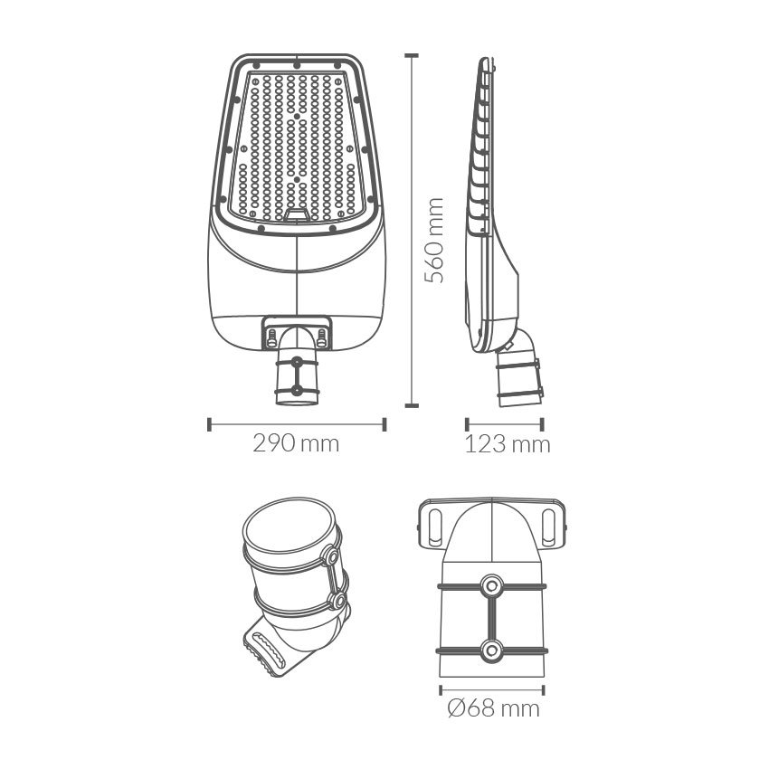 Luminaria vial para alumbrado público modelo Gadir regulable, 140w de potencia y luminosidad de 18200lm. Equipado con 192pcs led chip Lumileds SMD2835 y driver con tensión de 100-277vac. Apertura óptica asimétrica de 100ºx1130º y temperatura de color PC Ámbar. Grado de protección frente a elementos externos IP66 y grado de protección de resistencia mecánica a impactos IK09. Cuerpo de aluminio inyectado y acabado gris RAL 9007. Lentes de policarbonato. Brazo direccionable para instalación en báculo o columna. Certificado CE & ROHS